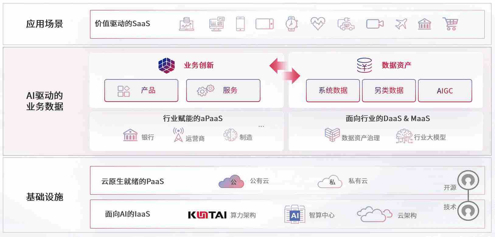 数字时代,,,围绕企业数字化转型的关键要素,,AG尊龙凯时数码开创性的提出数云融合战略和技术体系框架,,着力在云原生、、数字原生、、AI原生和信创产业上架构产品和服务能力,,为处在不同数字化转型阶段的快消零售、、、、汽车、、、金融、、、医疗、、、、政企、、教育、、、运营商等行业客户提供泛在的敏捷IT能力和融合的数据驱动能力,,,构建跨界融合创新的数字业务场景和新业务模式,,助力企业级客户建立面向未来的核心能力和竞争优势,,,全面推动社会的数字化、、智能化转型升级。。。。
