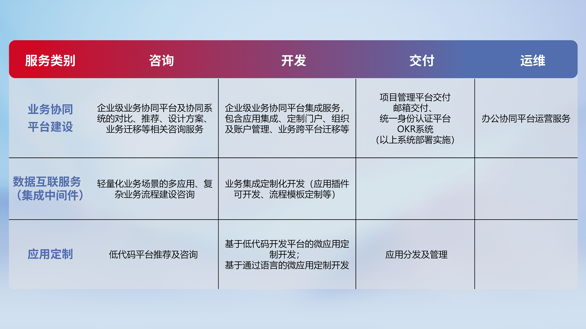 针对钉钉、、、企微、、、、IDaas等平台级产品提供产品的规划、、、、方案、、、、交付、、、定制化开发等服务,,实现如统一协同办公、、、、智能客户服务、、混合会议管理、、、智能数据查询、、、等业务场景,,实现数字化转型。。。。